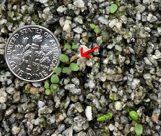 Wintergreen Very, very tiny cotyledons with pointed "leaf" tips. Arrow points to reddish first true leaf. Photo by Anne Klingensmith |
