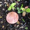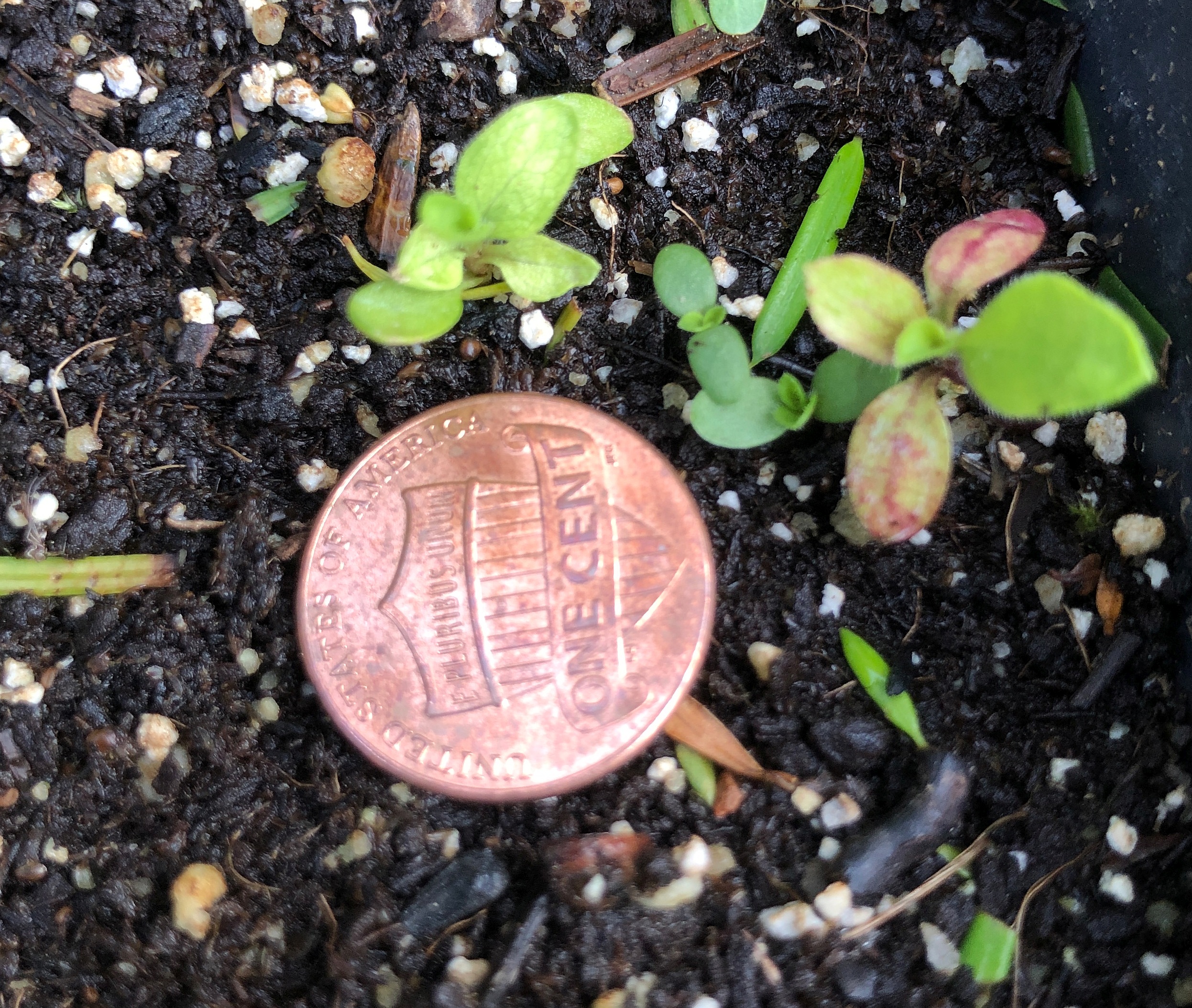 purple-stemmed angelica Note the red stems and veins, plus the simple, elongated cotyledons. Seeds are also visible (sow on surface) - germinating just to the right of coin. Photo by R Parker |